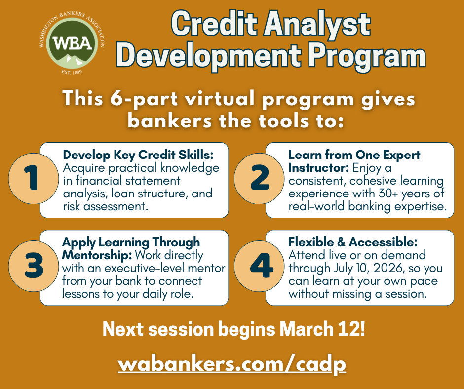 Brought to you by Washington Bankers Association, NH Bankers is pleased to join 16 additional state bankers associations to present the Credit Analyst Development Program (CADP) virtually March - May, 2026.